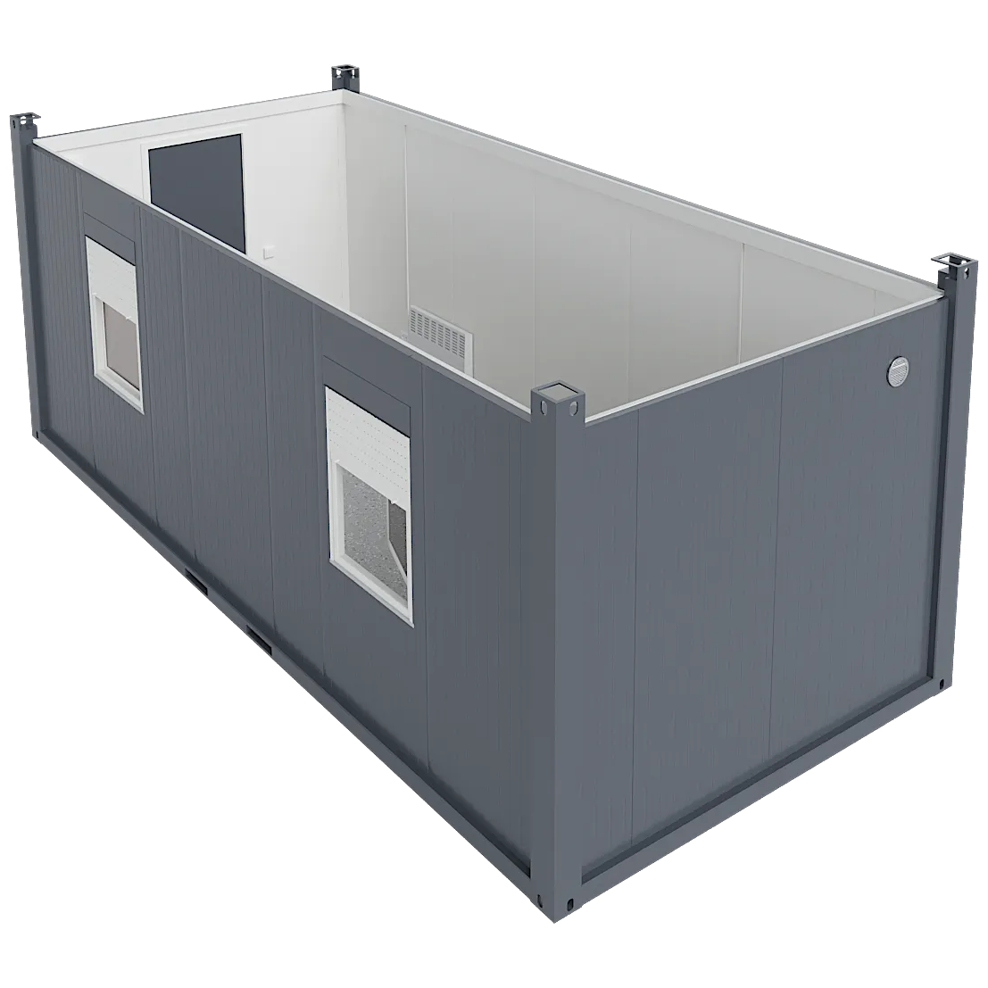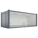 The 7 × 3.2 m Break Room can be equipped with several accessories and the desired layout. Popular accessories include air source heat pumps, computer sockets, heat recovery ventilation machine, and additional windows. The windows of the container have standard aluminium roller shutters, meaning that you can safely close up for the night, for example. Handling with crane from the corner pieces or forklift pockets.